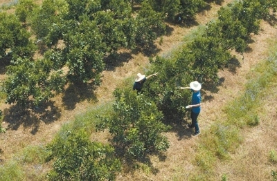 曹立新(右)在柑橘基地里給農(nóng)民做技術(shù)指導(dǎo)。鄭家裕攝