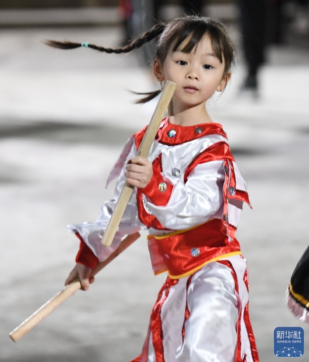 在貴嶼鎮(zhèn)玉窖村莊恩琪家的客廳里,擺著小鼓、小鈸、“小蛇”道具和“迷你版”英歌槌。莊恩琪的父親莊镕強(qiáng)是玉窖村玉和興英歌隊(duì)中的一名鑼鼓手。莊恩琪常跟著父親到英歌隊(duì)的排練場(chǎng),看著英歌隊(duì)“敲鑼打鼓跳英歌”,耳濡目染中對(duì)英歌舞產(chǎn)生了濃厚的興趣。 當(dāng)激昂的鼓點(diǎn)響起,莊恩琪變得專(zhuān)注,掄起小槌跟著隊(duì)員們舞動(dòng)起來(lái),“又猛又萌”的動(dòng)作讓圍觀(guān)的村民不時(shí)報(bào)以笑聲和掌聲。?