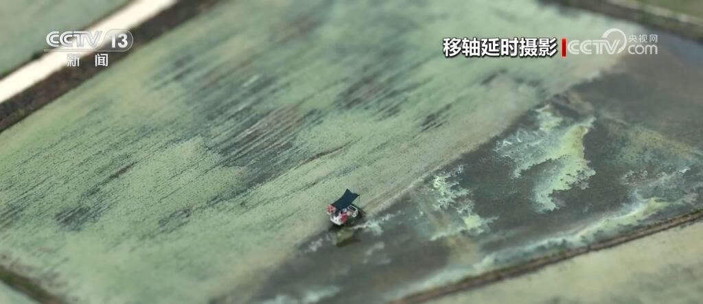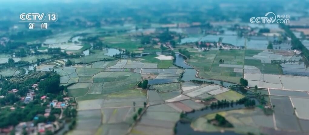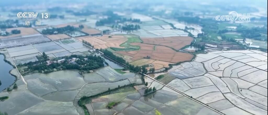 現(xiàn)在您看到的是河南信陽淮河以南的水稻插秧現(xiàn)場。插秧機在田間穿梭,一株株茁壯的秧苗被整齊有序地植入田間,一會兒工夫就插滿了整塊稻田??罩懈╊慌_臺插秧機在農機手的操控下好似一把把畫刷,在稻田上輕輕暈染,繪就丹青。而同在信陽,淮河以北的麥田里,則是金色的麥浪翻滾起伏,收割機馳騁田間,飽滿的麥穗被卷入機艙,經(jīng)過收割、脫粒,顆粒歸倉。