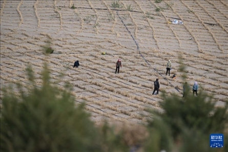 在其白線沙地綜合治理工程項目區(qū),記者跟隨治沙隊伍在松軟的沙丘上迎坡徒步前行,每走一步,退后半步,沙粒灌滿鞋履。然而,來自當(dāng)?shù)氐闹紊橙罕妳s早已習(xí)慣,他們兩三人一組,配合默契,有人拉著稻草橫放鋪平,有人則用工具按壓培土,還有人跟在后面,在鋪好的草方格里撒下草籽?!白罡叻宓臅r候每天有上千人參與治沙,推進速度很快。”劉環(huán)宇介紹,今年以來全旗已完成26.5萬畝的治沙任務(wù)。