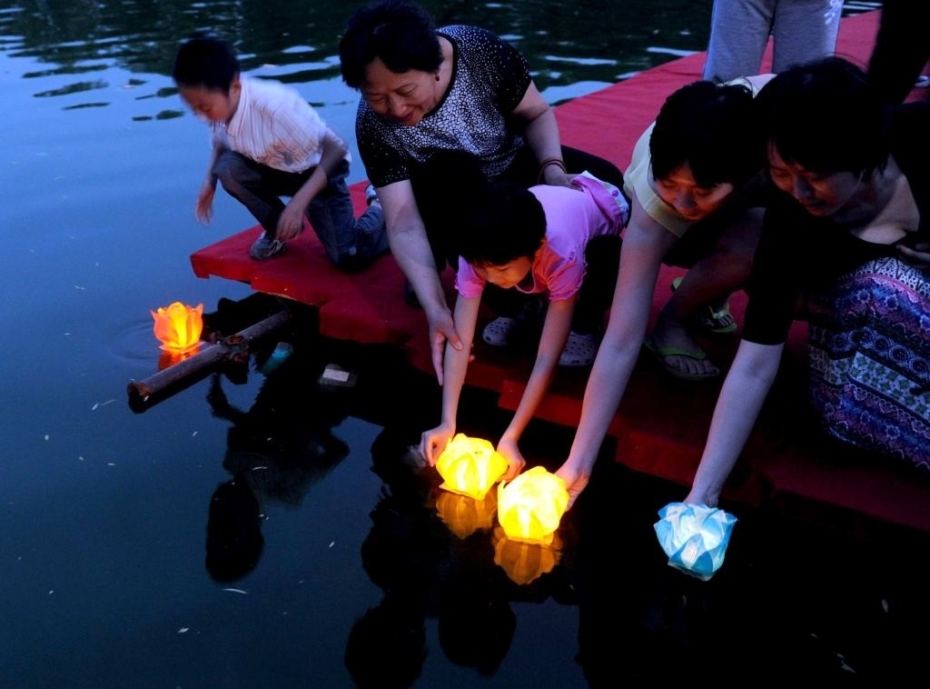 2011年6月4日,游客在北京龍?zhí)豆珗@參加端午節(jié)“祈福納吉”放河燈活動。