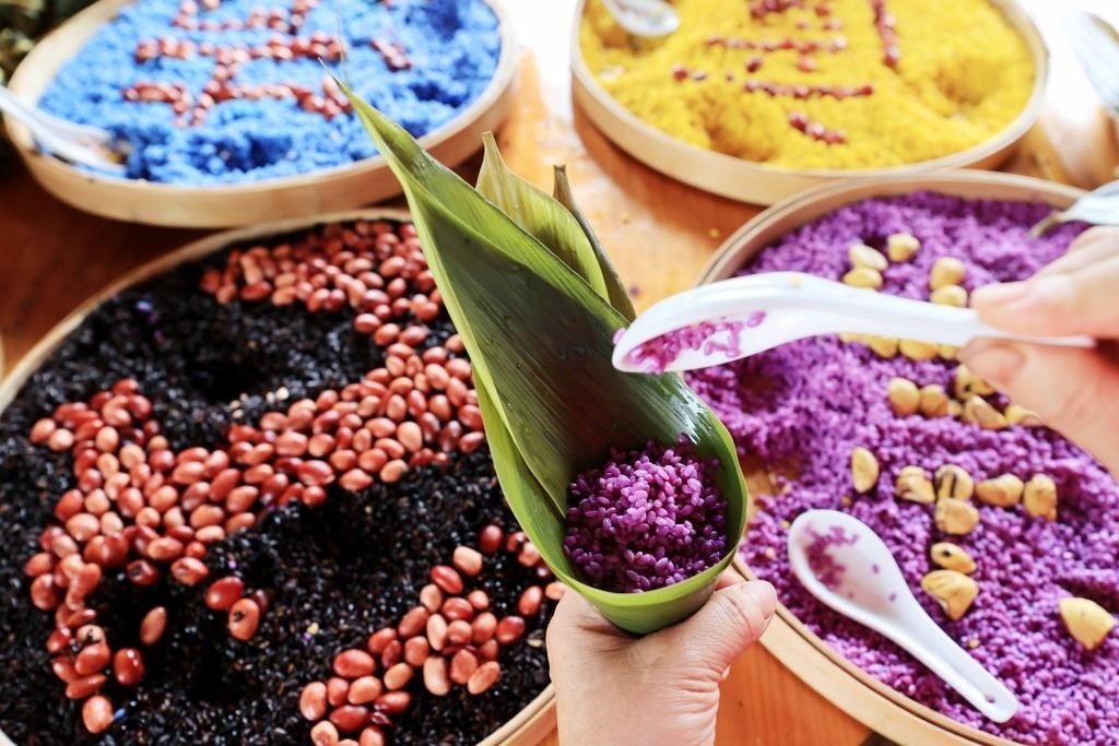 2022年5月25日,在廣西融安縣雅瑤鄉(xiāng)章口村西古坡屯,壯族村民在制作五彩粽,這是用山上生長的紅藍(lán)草、蘇木等植物煮水取汁后將糯米染色制成的。
