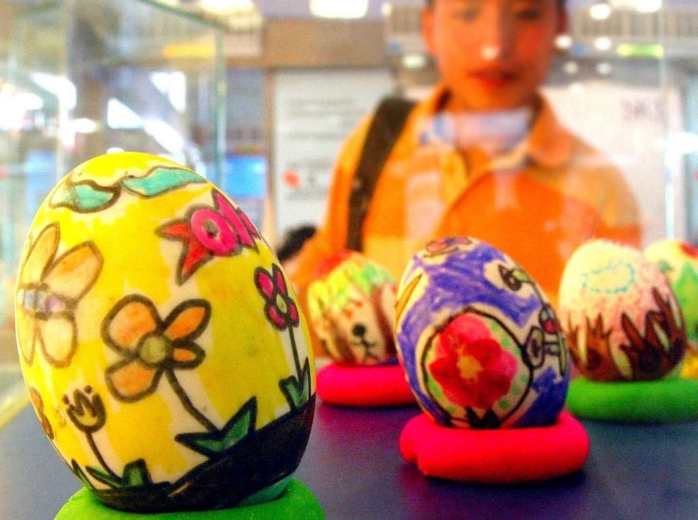 2004年6月22日,南京一商家展出的彩蛋引起人們的興趣。端午節(jié)吃鴨蛋是南京等地人們的傳統(tǒng)習(xí)俗。
