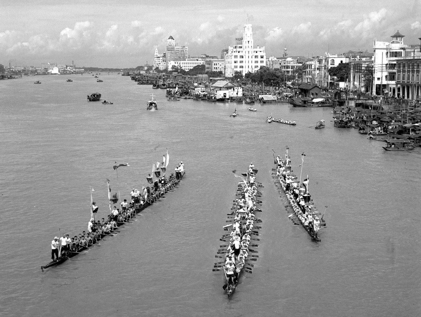 1955年,參加表演的龍舟經(jīng)過廣州市區(qū)的珠江水面。