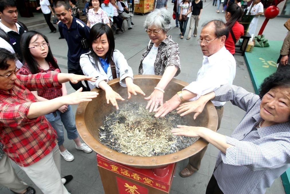 2009年5月26日,市民在上海豫園一家藥店門口體驗(yàn)端午節(jié)的傳統(tǒng)民俗——白芷熏香。