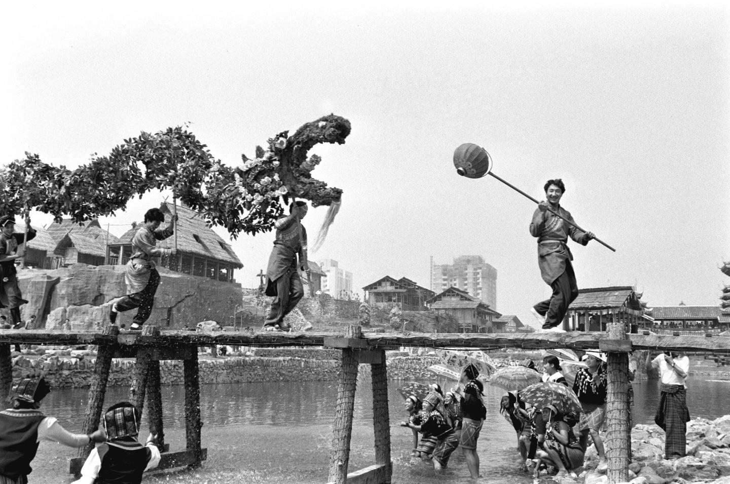 1995年6月2日,羌族青年在北京的中華民族園表演“飛龍過江”。
