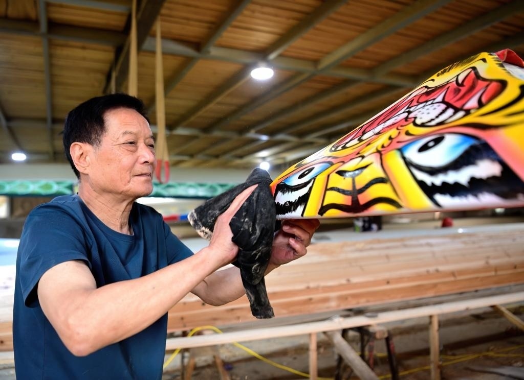 2024年6月3日,福州市非物質(zhì)文化遺產(chǎn)“方莊龍舟制造技藝(閩侯縣)”的傳承人方紹晃在擦拭準(zhǔn)備交付的龍舟船頭。方莊村是福建遠(yuǎn)近聞名的“龍舟村”,制造龍舟的技藝已傳承了700多年,每年有200余艘傳統(tǒng)龍舟銷往全國及海外。方紹晃介紹說,制作一艘福州傳統(tǒng)龍舟從原料選擇到制作都非常講究,主要選取閩北山區(qū)樹齡40年以上的杉木和樟木為原材料,歷經(jīng)做龍骨、釘?shù)装?、裝魚梁、拋光、畫花、上油漆等多道工序,最后裝上精心雕刻的龍頭才算大功告成。