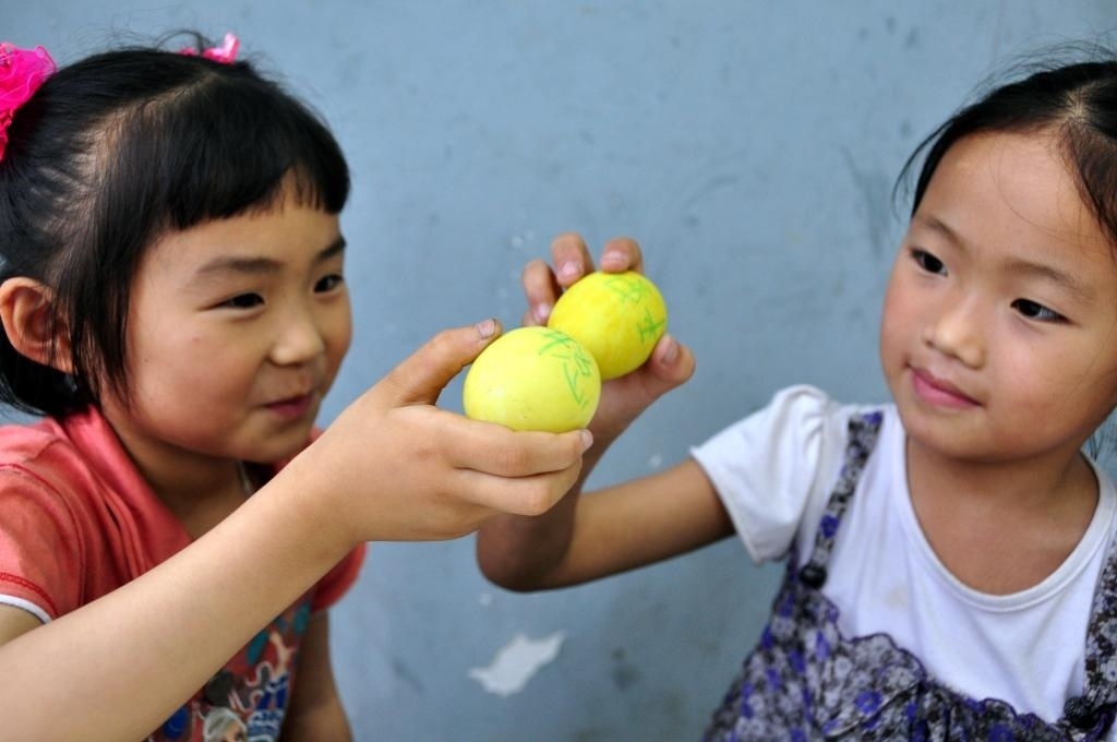 2010年6月13日,福建省莆田市城廂區(qū)第一實(shí)驗(yàn)小學(xué)舉行端午節(jié)傳統(tǒng)習(xí)俗“撞虎蛋”體驗(yàn)活動。學(xué)生們在經(jīng)五味草煮過的鴨蛋上寫下愿望,然后兩兩相撞,共祈今后更加平安、健康、聰明。這是兩位學(xué)生拿著寫有各自愿望的“虎蛋”相撞。