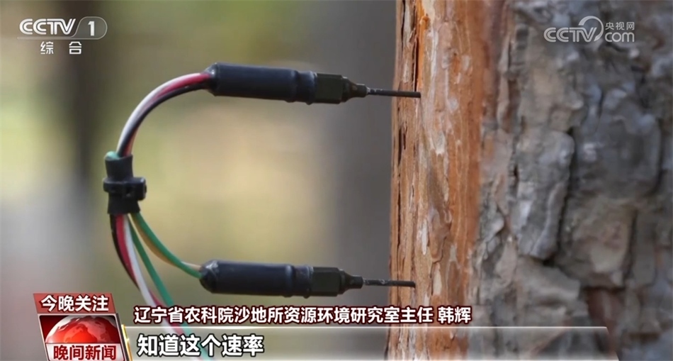 記者在采訪時看到,一棵樹的樹干上插了兩根探針,據(jù)遼寧省農科院沙地所資源環(huán)境研究室主任韓輝介紹,這是用來監(jiān)測樹干水分的。通過監(jiān)測兩根探針之間的溫差,他們就能夠計算出這棵樹的液流速率。知道這個速率,他們就可以了解這棵樹的生長狀態(tài),這個實驗的最終目的,是想得出在單位面積上到底有多少棵樟子松最合理。