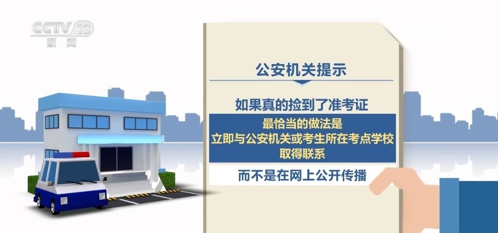 公安機(jī)關(guān)提示:如果真的撿到了準(zhǔn)考證,最恰當(dāng)?shù)淖龇ㄊ橇⒓磁c公安機(jī)關(guān)或考生所在考點(diǎn)學(xué)校取得聯(lián)系,而不是在網(wǎng)上公開傳播。另外,如果看到此類信息的網(wǎng)友,未經(jīng)核實(shí)的情況下不轉(zhuǎn)發(fā)、不跟貼、不評(píng)論,不撥打相關(guān)聯(lián)系電話,謹(jǐn)防上當(dāng)受騙。