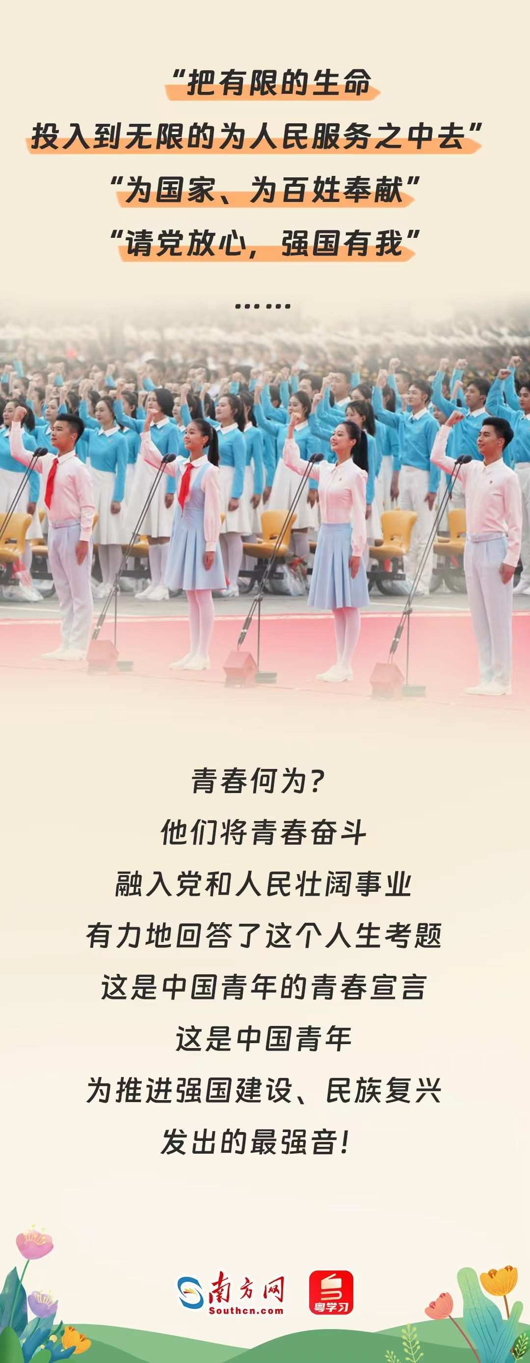 時代的每一次前行,都閃耀著青年奮勇拼搏的身影。一代又一代的中國青年滿懷對祖國和人民的赤子之心,積極投身黨領導的偉大事業(yè),為人民戰(zhàn)斗、為祖國獻身、為幸福生活奮斗,用行動奮力踐行著自己的青春宣言。