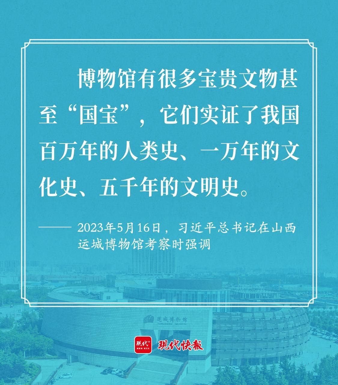 2023年5月16日,習(xí)近平總書記考察山西運(yùn)城博物館時強(qiáng)調(diào),博物館有很多寶貴文物甚至“國寶”,它們實證了我國百萬年的人類史、一萬年的文化史、五千年的文明史。