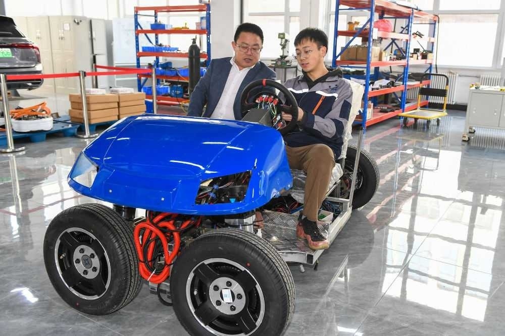 2024年3月13日,在吉林長春一家汽車科技企業(yè),吉林大學汽車工程學院教授靳立強(左)試乘智能底盤樣車。2023年,長春市科技局和吉林大學共建吉林大學概念驗證中心,一手對接高校,一手對接企業(yè),確??蒲谐晒诩夹g(shù)路線和商業(yè)模式上的可行性,實現(xiàn)“從0到1”的轉(zhuǎn)化。