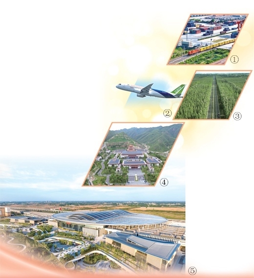 圖①:中歐班列從國鐵集團(tuán)鄭州局圃田車站駛出。國 徽攝(影像中國)圖②:國產(chǎn)大型客機(jī)C919。鄧智煒攝(新華社發(fā))圖③:新疆溫宿縣柯柯牙的“三北”防護(hù)林。新華社記者 李 響攝圖④:中國國家版本館中央總館。本報記者 陳 斌攝圖⑤:雄安站。宋 宇攝(影像中國)