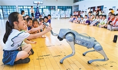 安徽省安慶市科普大篷車巡展活動走進(jìn)岳西縣菖蒲鎮(zhèn)中心學(xué)校。圖為學(xué)生與機(jī)器狗互動。王先國攝(影像中國)