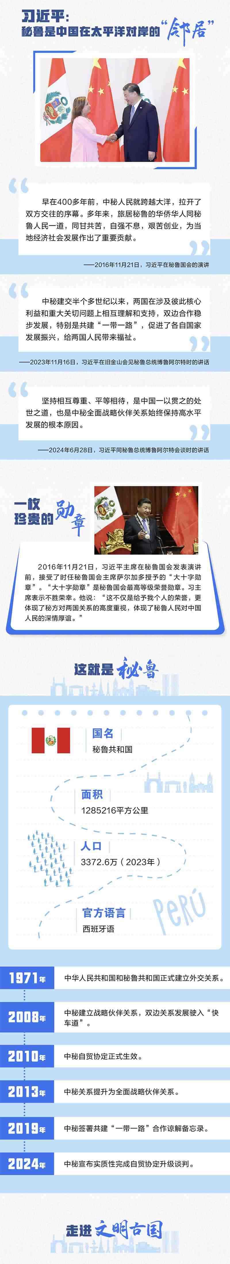 應秘魯共和國總統(tǒng)博魯阿爾特邀請,習近平主席將對秘魯進行國事訪問。不到半年的時間,中秘領導人實現(xiàn)互訪,顯示了雙方高水平的政治互信。