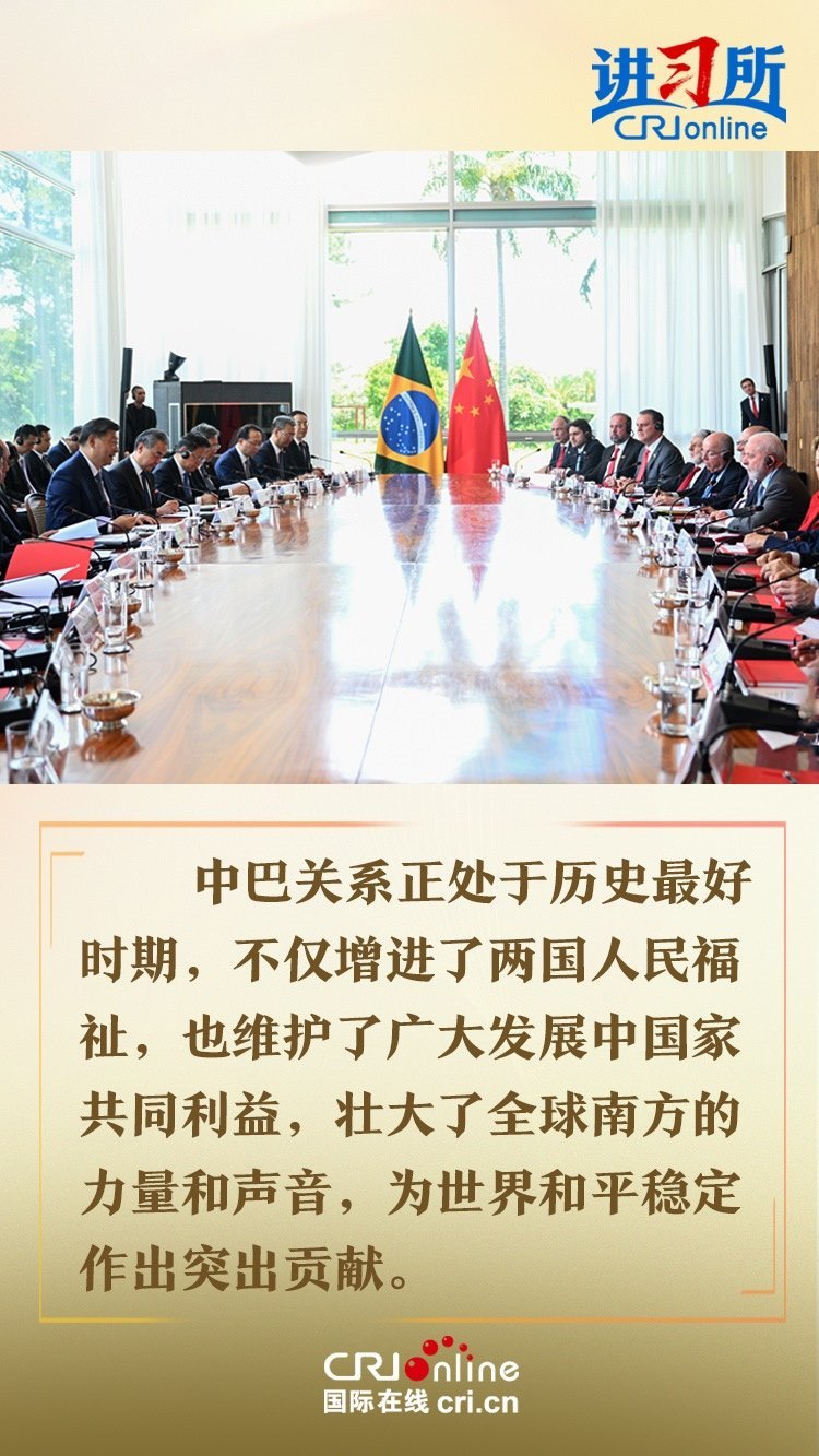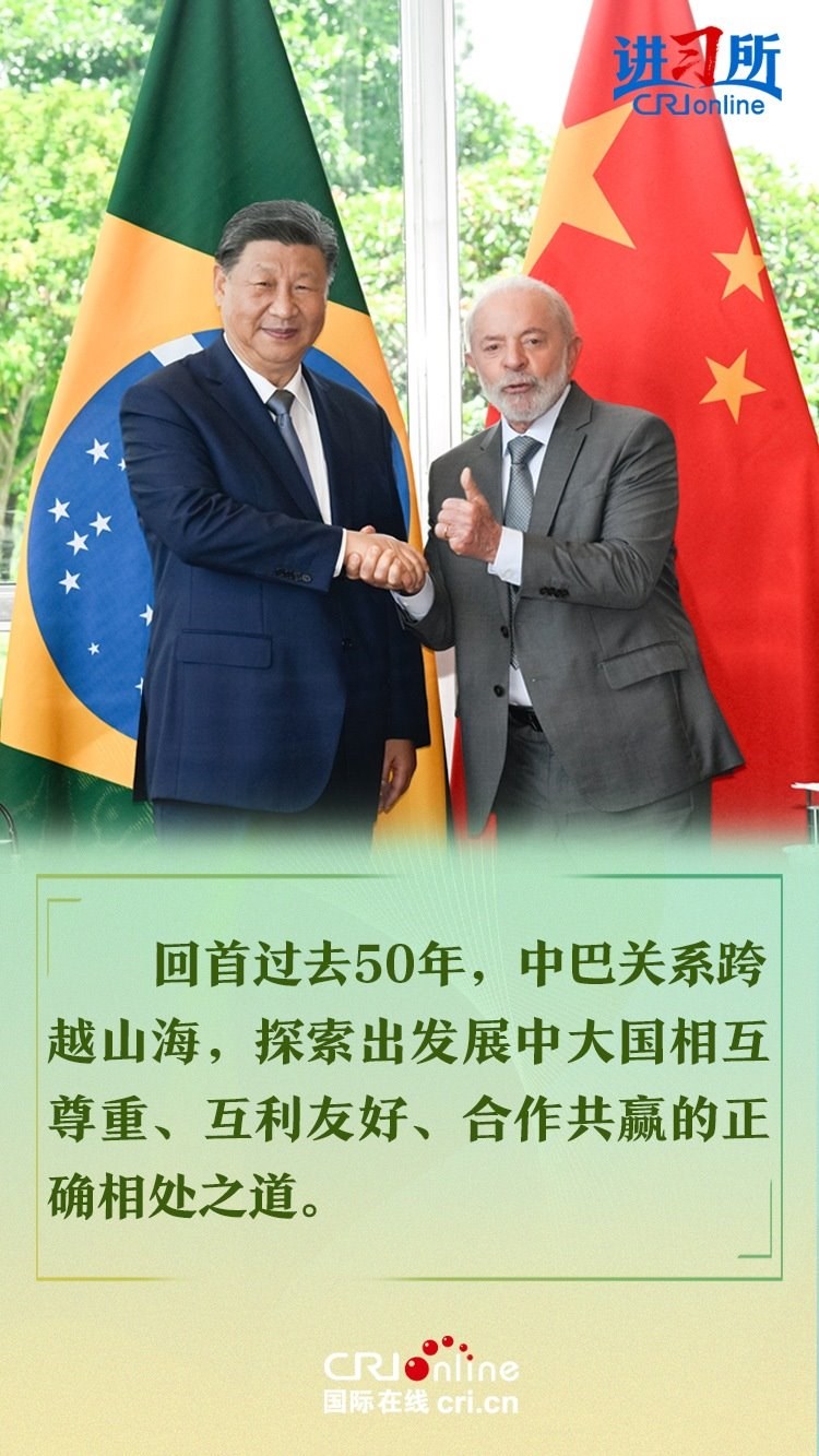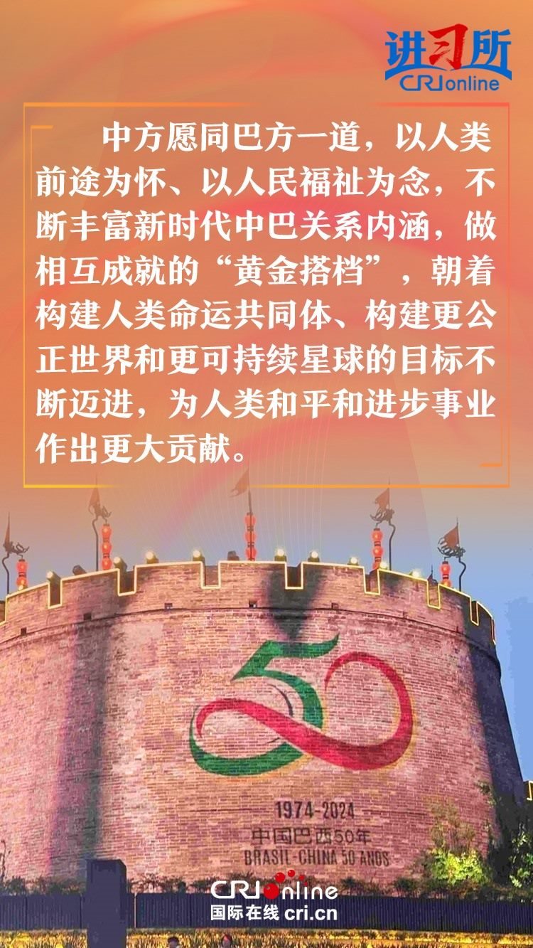 今年是中巴建交50周年。習(xí)近平指出,回首過(guò)去50年,中巴關(guān)系跨越山海,探索出發(fā)展中大國(guó)相互尊重、互利友好、合作共贏的正確相處之道。中方愿同巴方一道,以人類前途為懷、以人民福祉為念,不斷豐富新時(shí)代中巴關(guān)系內(nèi)涵,做相互成就的“黃金搭檔”,朝著構(gòu)建人類命運(yùn)共同體、構(gòu)建更公正世界和更可持續(xù)星球的目標(biāo)不斷邁進(jìn),為人類和平和進(jìn)步事業(yè)作出更大貢獻(xiàn)。
