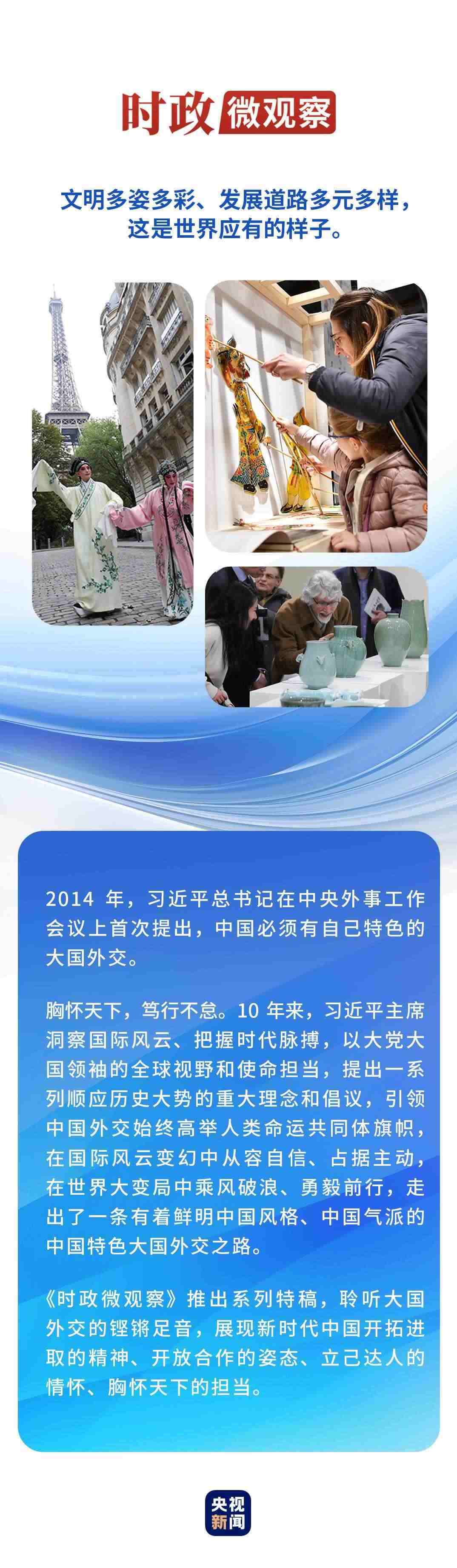 文明如水,潤物無聲。回望中國特色大國外交的10年歷程,習(xí)近平主席以開闊的文化視野、深厚的文化積淀和堅定的文化自信,親自推動不同文明交流交融、互學(xué)互鑒,為建設(shè)美好世界注入深厚持久力量。