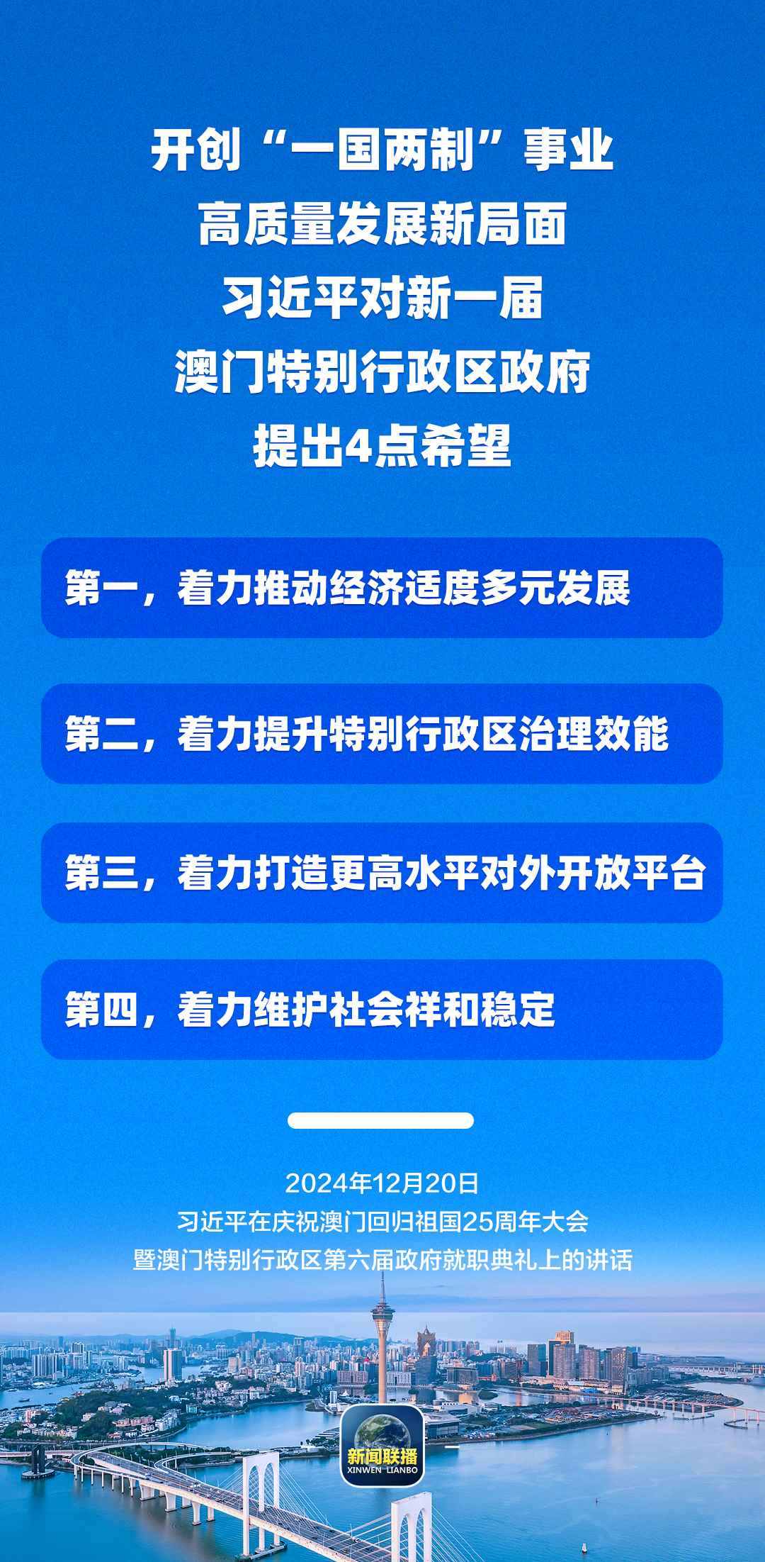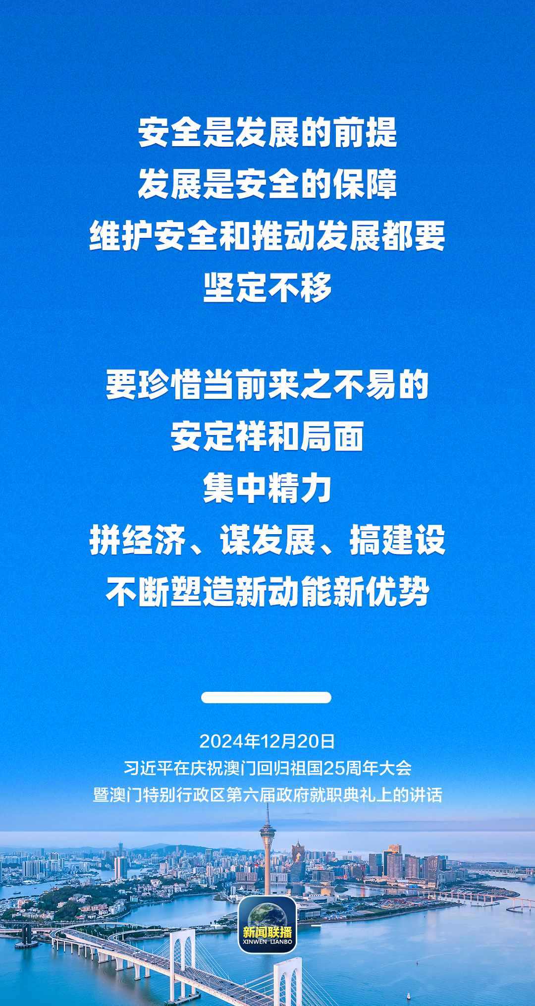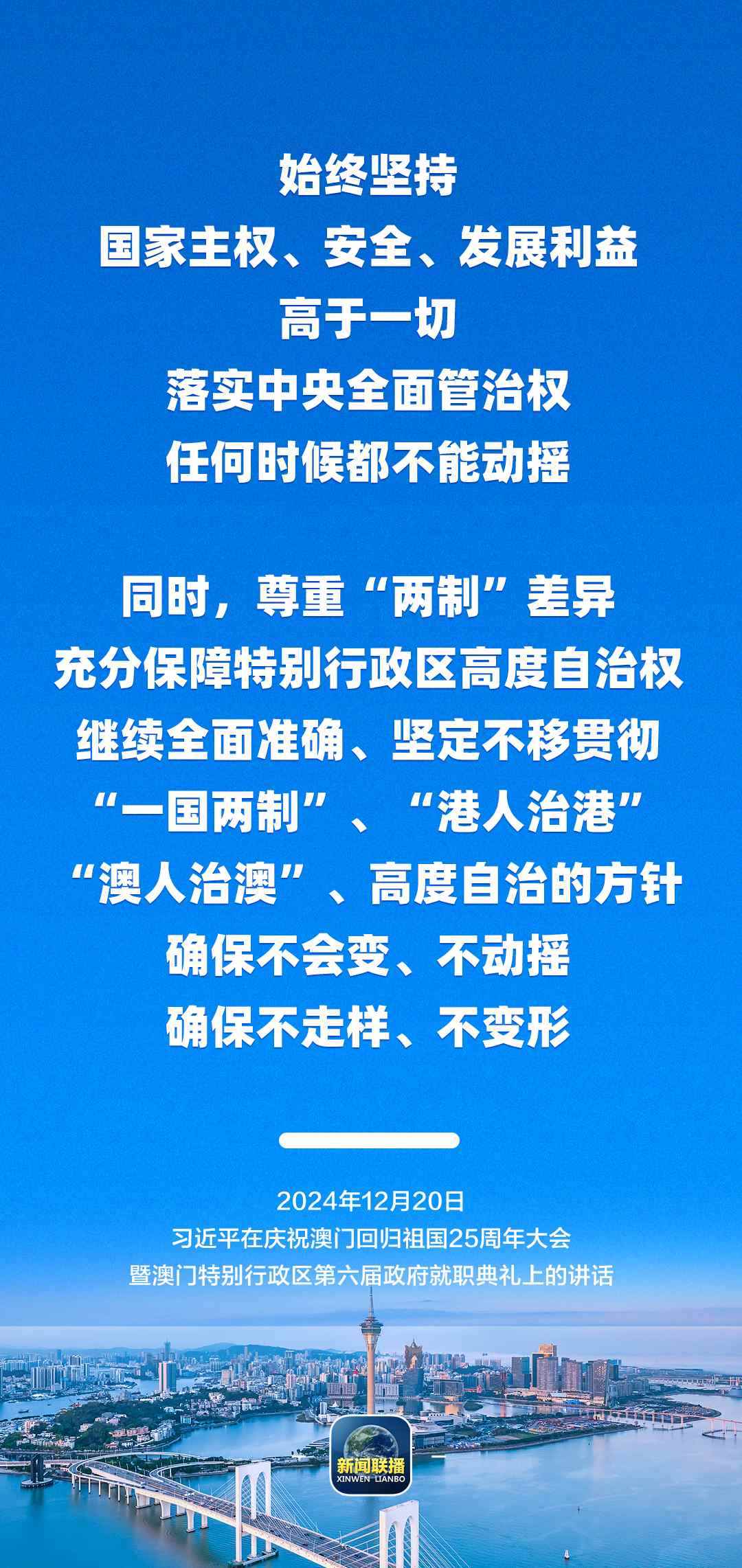 習(xí)近平強(qiáng)調(diào),只要全面準(zhǔn)確、堅定不移貫徹“一國兩制”方針,有特別行政區(qū)政府和社會各界共同努力,有偉大祖國作堅強(qiáng)后盾,澳門一定能打開發(fā)展新天地、不斷創(chuàng)造新輝煌,一定能為以中國式現(xiàn)代化全面推進(jìn)強(qiáng)國建設(shè)、民族復(fù)興偉業(yè)作出更大貢獻(xiàn)。