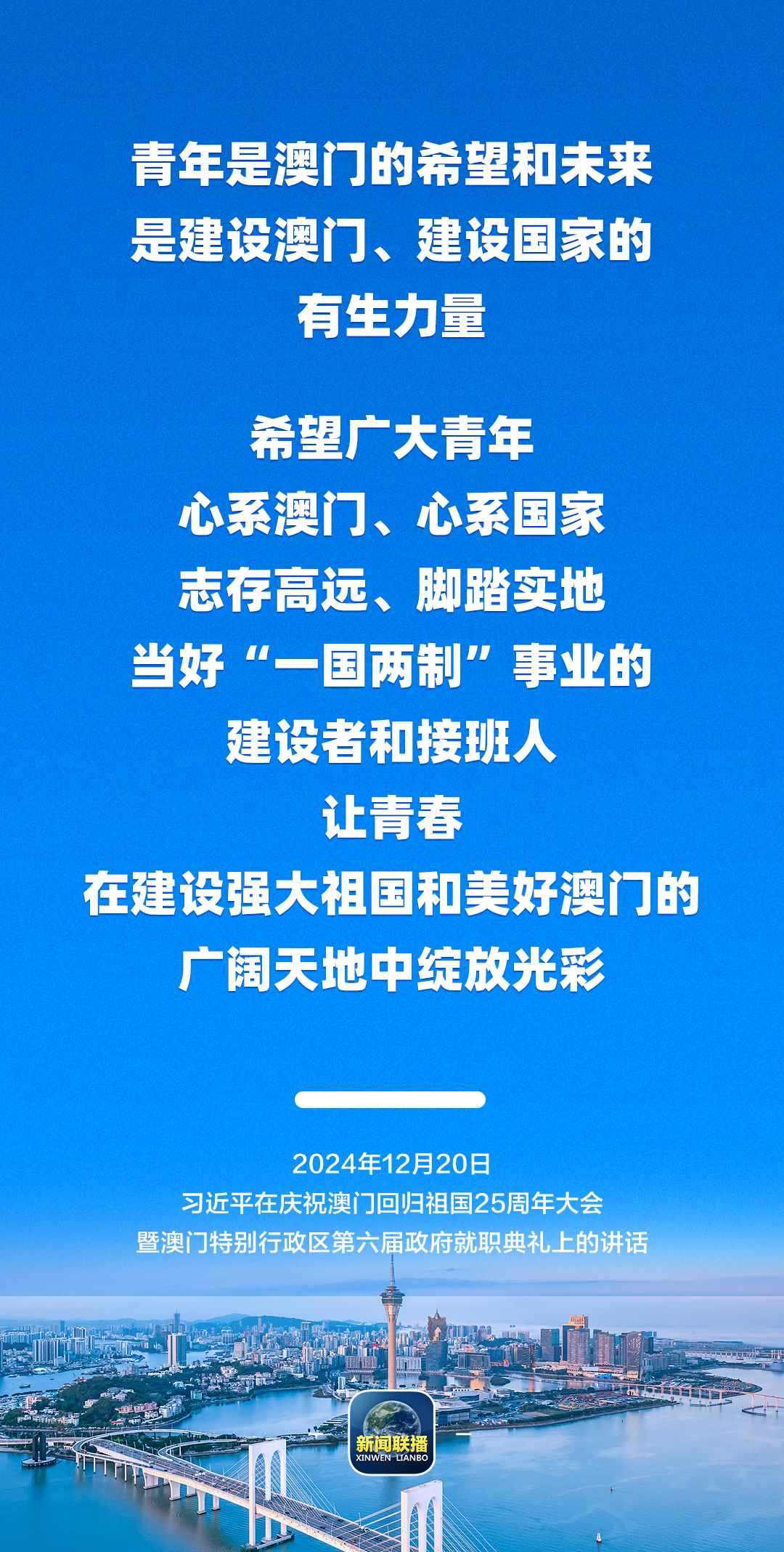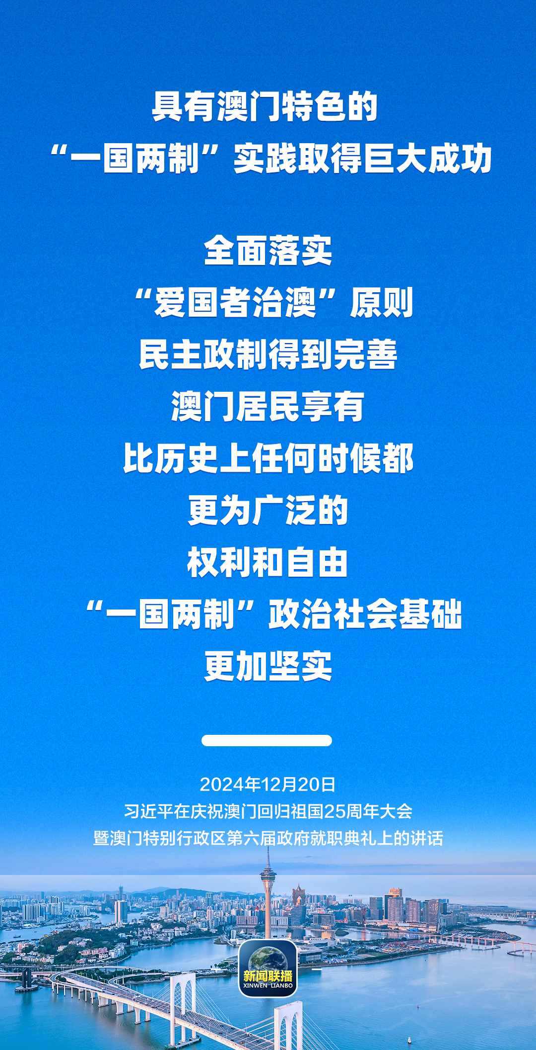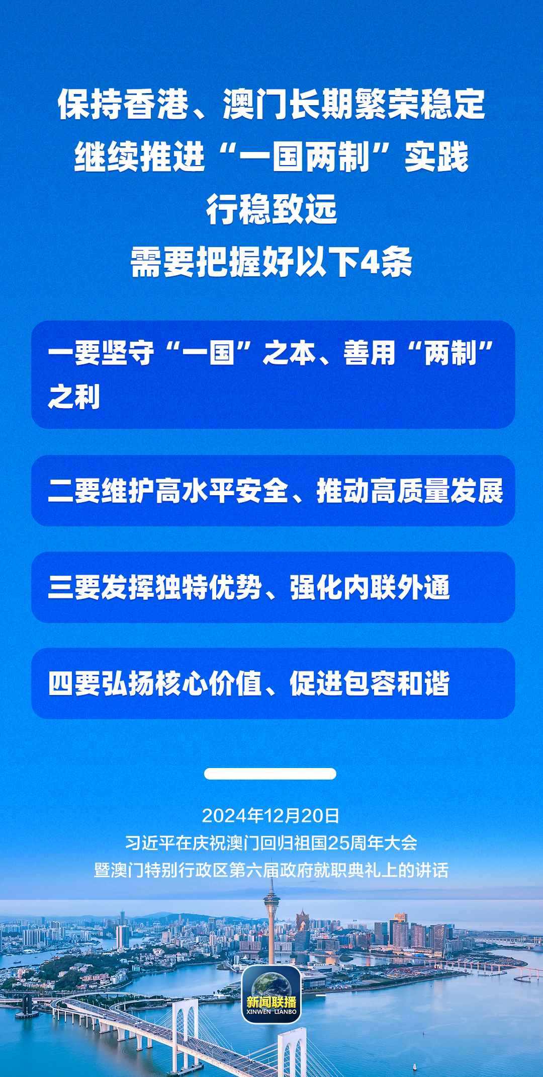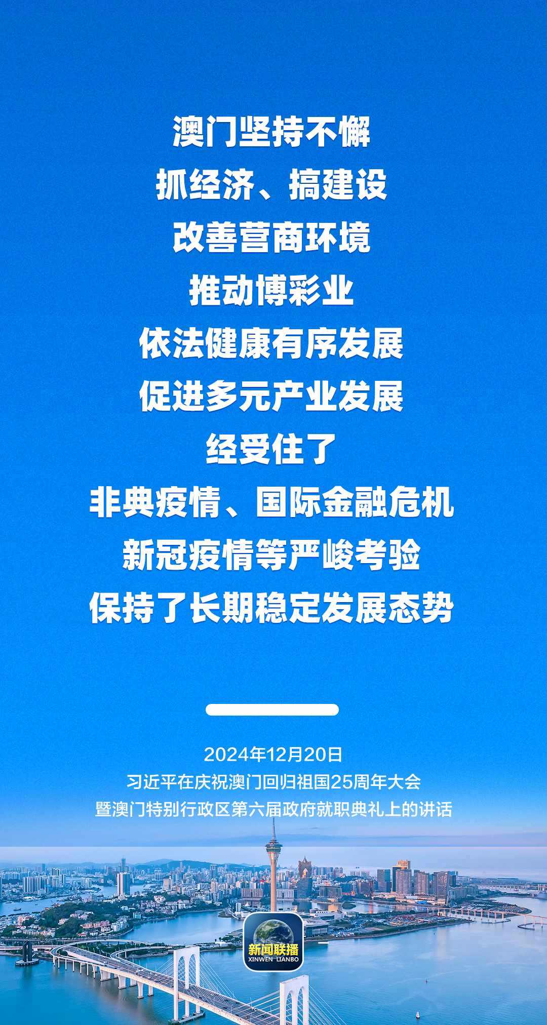習(xí)近平強(qiáng)調(diào),只要全面準(zhǔn)確、堅定不移貫徹“一國兩制”方針,有特別行政區(qū)政府和社會各界共同努力,有偉大祖國作堅強(qiáng)后盾,澳門一定能打開發(fā)展新天地、不斷創(chuàng)造新輝煌,一定能為以中國式現(xiàn)代化全面推進(jìn)強(qiáng)國建設(shè)、民族復(fù)興偉業(yè)作出更大貢獻(xiàn)。