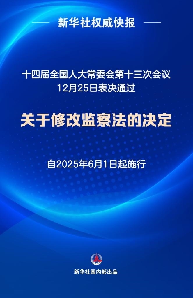 12月25日,十四屆全國人大常委會第十三次會議表決通過關(guān)于修改監(jiān)察法的決定,自2025年6月1日起施行。