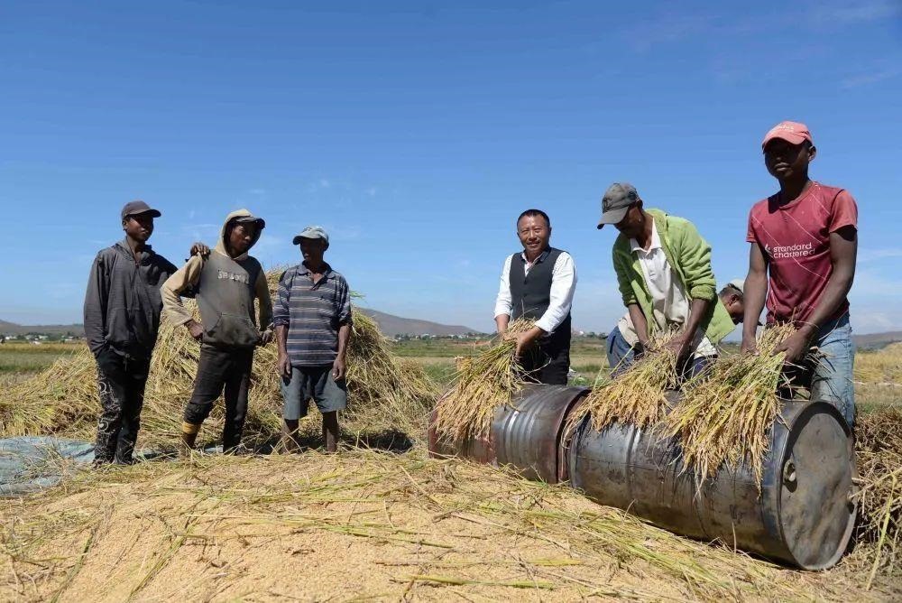 △在馬達加斯加,中國雜交水稻技術(shù)專家和當?shù)剞r(nóng)民一起收獲水稻。