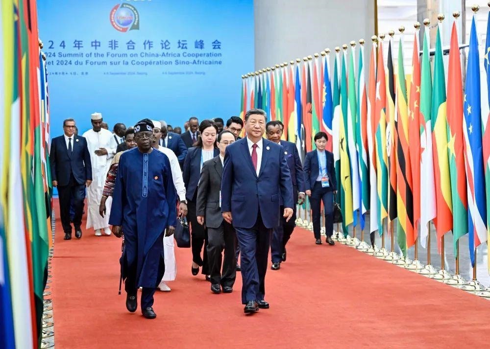 △2024年9月5日,中非合作論壇北京峰會開幕式,習近平主席同外方領導人共同步入會場。