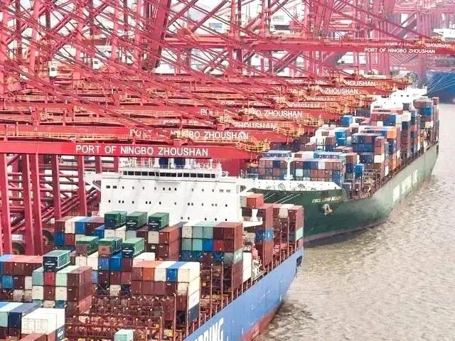 △遠洋貨輪在浙江寧波舟山港梅山港區(qū)裝卸貨物。