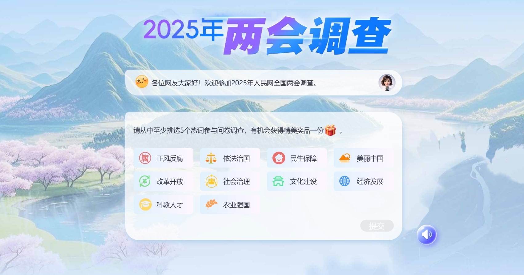 為感謝網(wǎng)友對人民網(wǎng)2025年全國兩會調(diào)查的支持,參與者有機會抽取精美獎品1份。