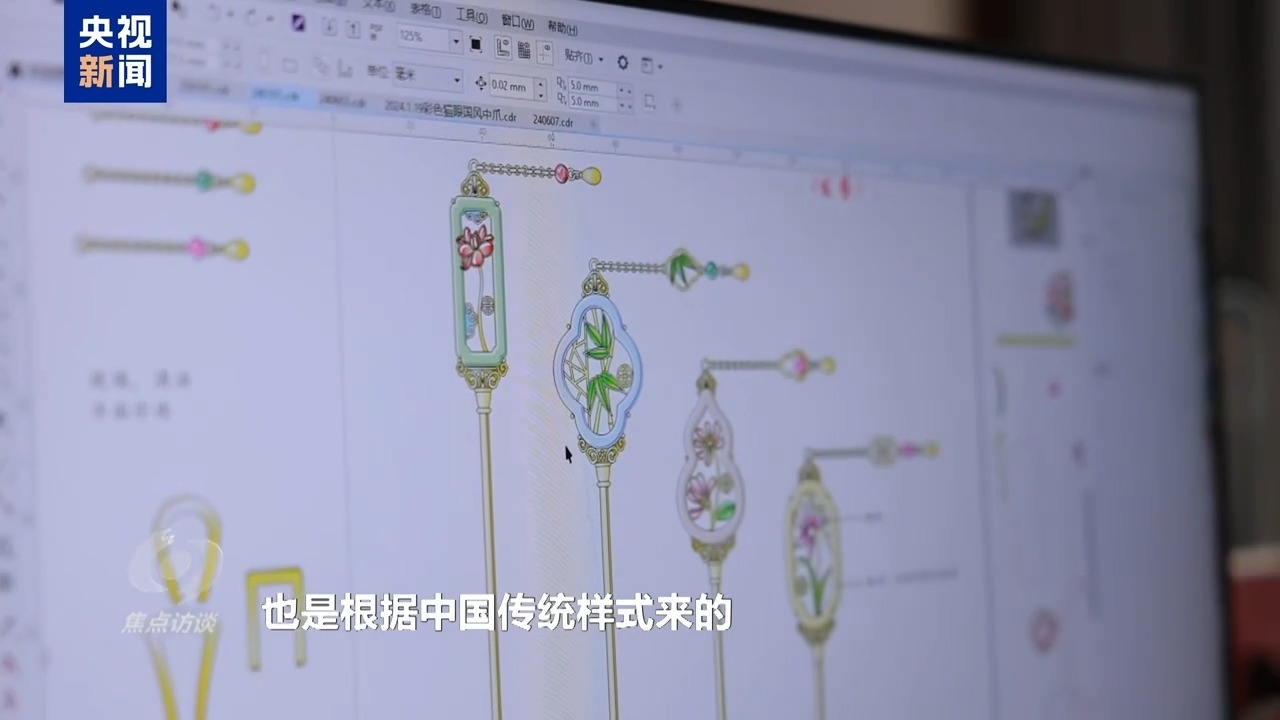 義烏某飾品公司產(chǎn)品設(shè)計(jì)師 周亮:梅蘭竹菊有傳統(tǒng)的一些寓意,然后這些圖案的外形,也是根據(jù)中國(guó)傳統(tǒng)樣式來的。材料方面,我主要是想體現(xiàn)中國(guó)的那種翡翠的感覺。