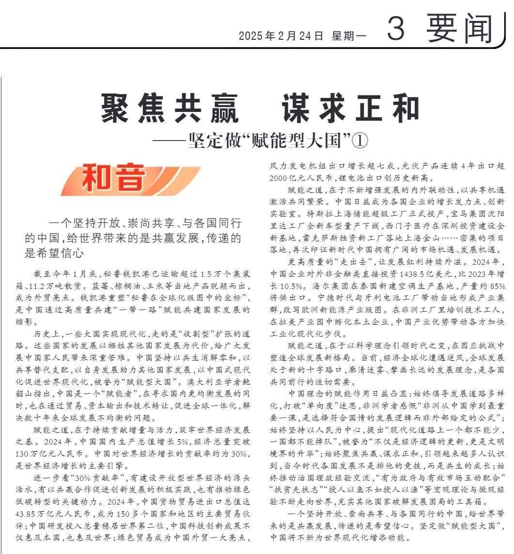 近期,《人民日報》“和音”欄目推出“堅定做‘賦能型大國’”系列評論,圍繞科技創(chuàng)新、開放共贏、綠色轉(zhuǎn)型、高質(zhì)量共建“一帶一路”、多邊治理等熱點議題,從不同角度闡釋中國何以成為一個“賦能型大國”的深層邏輯,展現(xiàn)中國始終秉持構(gòu)建人類命運共同體理念,不斷以中國式現(xiàn)代化為世界現(xiàn)代化賦能的大國擔(dān)當(dāng)。