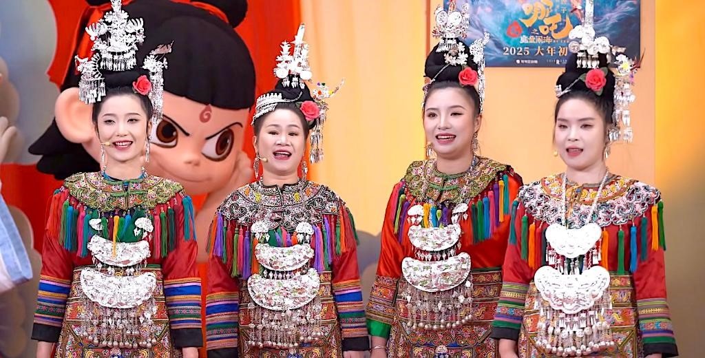 近日,貴州“舞樂蟬歌”樂團(tuán)的成員們,在電影《哪吒之魔童鬧海》的新春鬧海直播現(xiàn)場(chǎng)表演侗族大歌。(受訪者供圖)