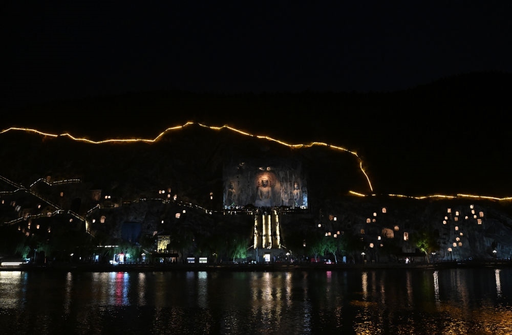 2025年4月24日,游客在龍門(mén)石窟夜游。