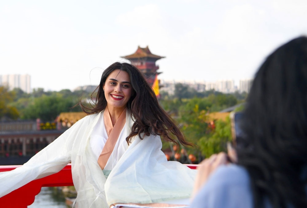 2024年10月18日,外國(guó)游客在清明上河園內(nèi)游玩。