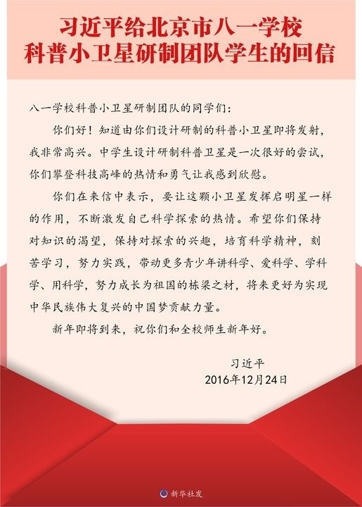 三個多月后,同學(xué)們給習(xí)近平總書記寫信,報告小衛(wèi)星即將發(fā)射的消息,很快收到了總書記的回信。習(xí)近平總書記在回信中說,“你們攀登科技高峰的熱情和勇氣讓我感到欣慰”“希望你們保持對知識的渴望,保持對探索的興趣,培育科學(xué)精神,刻苦學(xué)習(xí),努力實踐,帶動更多青少年講科學(xué)、愛科學(xué)、學(xué)科學(xué)、用科學(xué),努力成長為祖國的棟梁之材”。