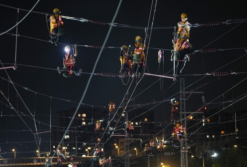 6月19日,在成渝中線高鐵成都站南北站場(chǎng)交替施工現(xiàn)場(chǎng),中國(guó)中鐵電氣化局的施工人員在南站場(chǎng)進(jìn)行接觸網(wǎng)施工作業(yè)。
