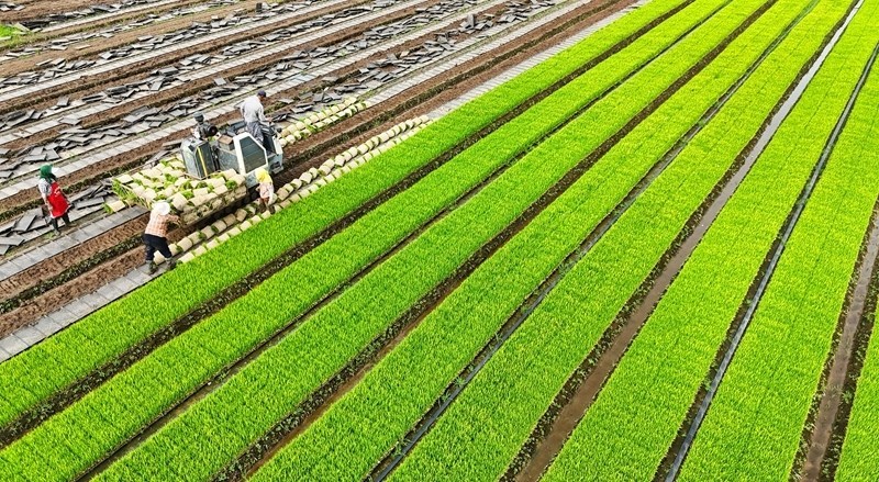 6月19日,在江蘇省連云港市東??h張灣鄉(xiāng)張灣村秧板田里,農(nóng)民起水稻秧苗準(zhǔn)備進(jìn)行機(jī)插作業(yè)(無人機(jī)照片)。