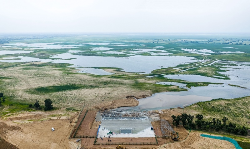 6月30日拍攝的引綽濟(jì)遼工程通遼市莫力廟水庫(kù)出水口(無(wú)人機(jī)照片)。