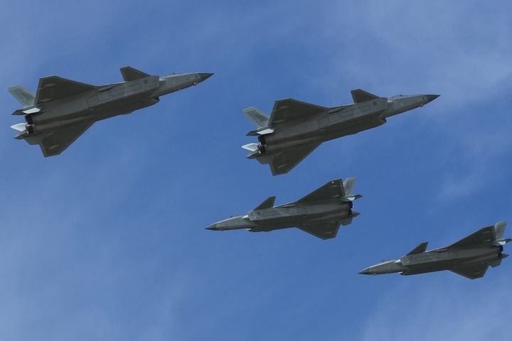 ↑9月19日,殲-20進(jìn)行四機(jī)編隊機(jī)動飛行展示。新華社記者 許暢 攝