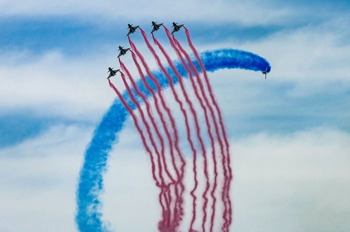 10時許,空軍航空大學(xué)“紅鷹”飛行表演隊采取雙四機(jī)超密集編隊起飛,拉開飛行表演序幕。8架紅白藍(lán)涂裝的教-8飛機(jī)完成機(jī)群集合后,以經(jīng)典的“紅鷹”編隊動作通場,八機(jī)鉆石斤斗、六機(jī)快滾、雙機(jī)點贊、單機(jī)盤旋繞軸、七機(jī)開花等19個動作高水平呈現(xiàn)。