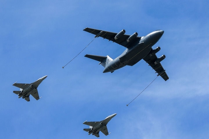 ↑9月19日,運(yùn)油-20A和殲-16編隊通場。新華社記者 顏麟蘊(yùn) 攝