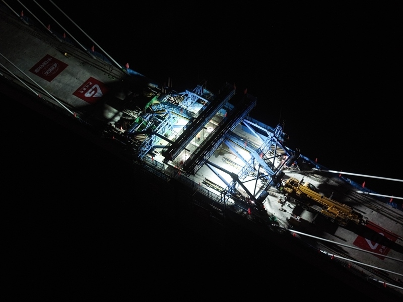 6月30日晚拍攝的滬渝蓉高鐵通泰揚特大橋跨引江河斜拉橋施工現(xiàn)場(無人機照片)。