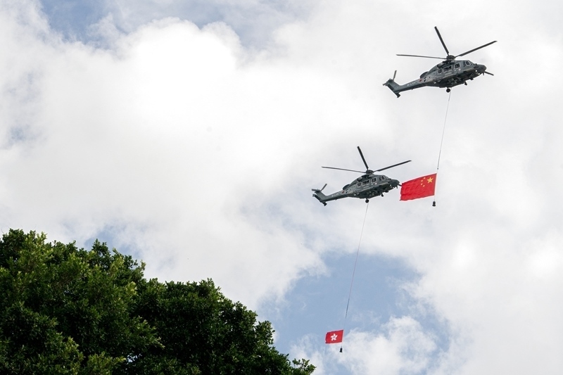7月1日,香港特區(qū)政府在金紫荊廣場舉行升旗儀式,慶祝香港回歸祖國28周年。這是分別懸掛中華人民共和國國旗、香港特區(qū)區(qū)旗的直升機(jī)從空中飛過。