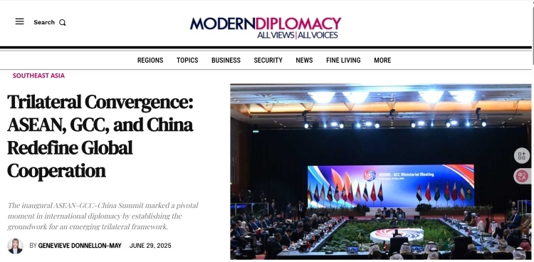 6月29日,歐洲《現(xiàn)代外交》網(wǎng)站刊發(fā)評(píng)論文章《三方協(xié)同:東盟、海合會(huì)與中國(guó)重新定義全球合作》。文章從不久前圓滿(mǎn)閉幕的首屆東盟—中國(guó)—海合會(huì)峰會(huì)出發(fā),指出東盟、海合會(huì)與中國(guó)之間的三方合作對(duì)推動(dòng)世界多極化、促進(jìn)全球南方國(guó)家發(fā)展具有重要意義,中國(guó)作為負(fù)責(zé)任大國(guó)在全球治理中發(fā)揮了關(guān)鍵領(lǐng)導(dǎo)作用。