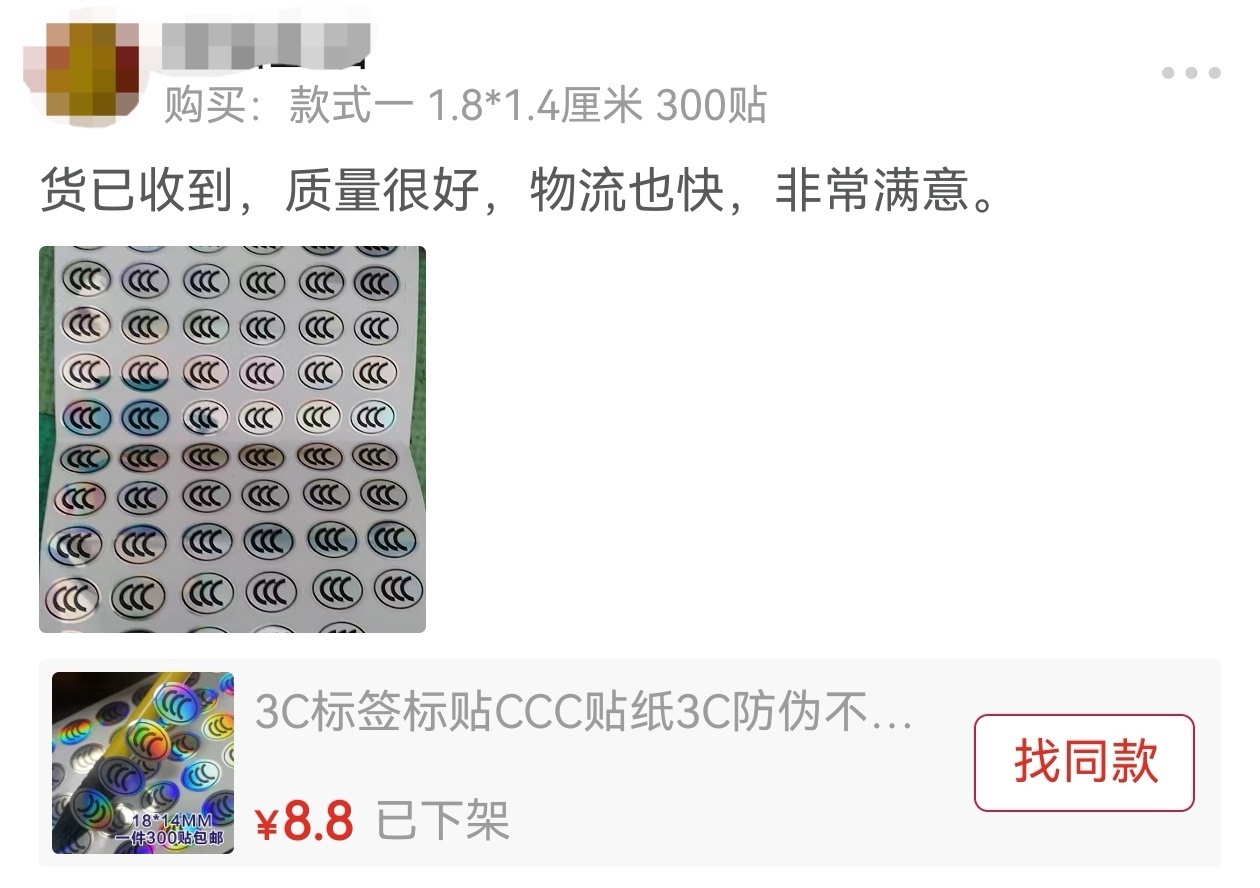 不過,這卻變成了一些人眼中的“商機(jī)”。中國新聞網(wǎng)《民生調(diào)查局》記者在部分電商平臺發(fā)現(xiàn),“3C貼紙”目前仍有售賣,甚至可以隨意定制。