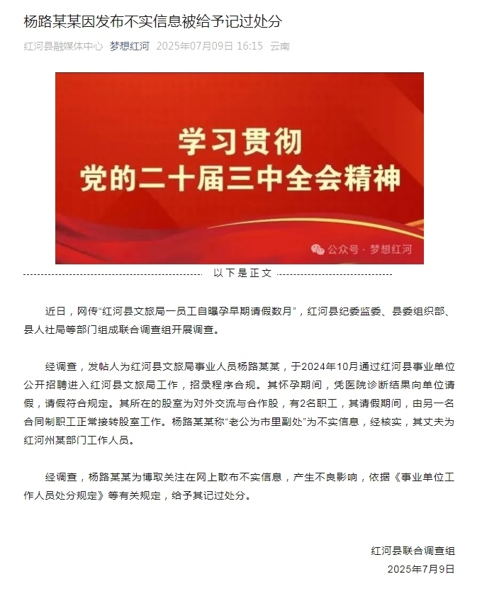經(jīng)調(diào)查,發(fā)帖人為紅河縣文旅局事業(yè)人員楊路某某,于2024年10月通過(guò)紅河縣事業(yè)單位公開(kāi)招聘進(jìn)入紅河縣文旅局工作,招錄程序合規(guī)。其懷孕期間,憑醫(yī)院診斷結(jié)果向單位請(qǐng)假,請(qǐng)假符合規(guī)定。其所在的股室為對(duì)外交流與合作股,有2名職工,其請(qǐng)假期間,由另一名合同制職工正常接轉(zhuǎn)股室工作。楊路某某稱(chēng)“老公為市里副處”為不實(shí)信息,經(jīng)核實(shí),其丈夫?yàn)榧t河州某部門(mén)工作人員。