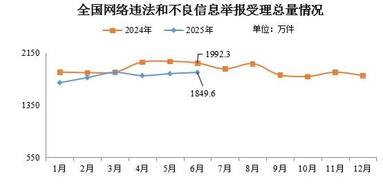 中新網(wǎng)7月9日電 據(jù)“中央網(wǎng)信辦舉報(bào)中心”微信公眾號(hào)消息,2025年6月,中央網(wǎng)信辦舉報(bào)中心指導(dǎo)全國(guó)各級(jí)網(wǎng)信舉報(bào)工作部門、主要網(wǎng)站平臺(tái)受理網(wǎng)民舉報(bào)色情、賭博、侵權(quán)、謠言等違法和不良信息1849.6萬(wàn)件,環(huán)比增長(zhǎng)1.1%、同比下降7.2%。其中,中央網(wǎng)信辦舉報(bào)中心受理舉報(bào)39.8萬(wàn)件,環(huán)比下降9.5%、同比下降15.1%;各地網(wǎng)信舉報(bào)工作部門受理舉報(bào)63.7萬(wàn)件,環(huán)比增長(zhǎng)6.6%、同比下降50%;全國(guó)主要網(wǎng)站平臺(tái)受理舉報(bào)1746.1萬(wàn)件,環(huán)比增長(zhǎng)1.2%、同比下降4%。