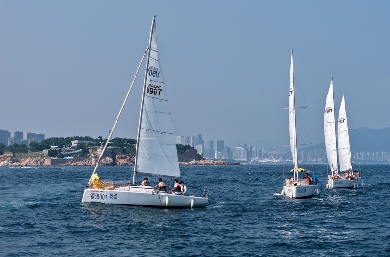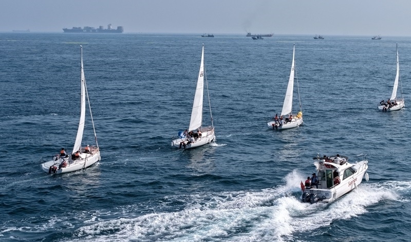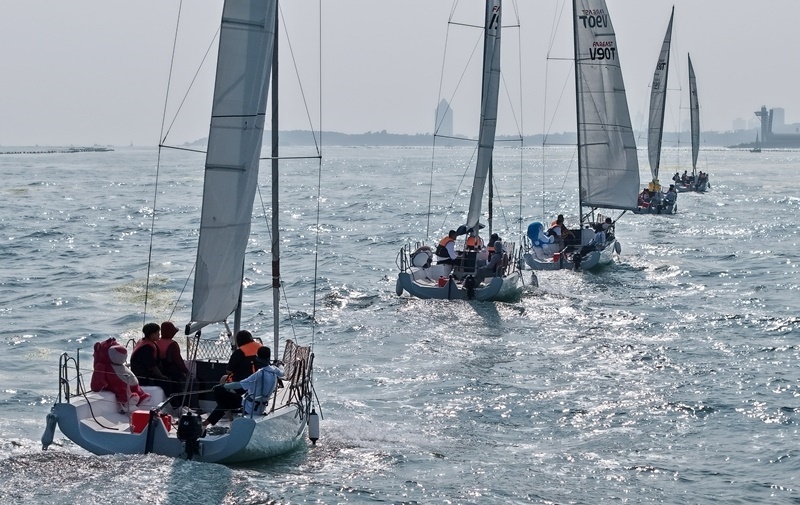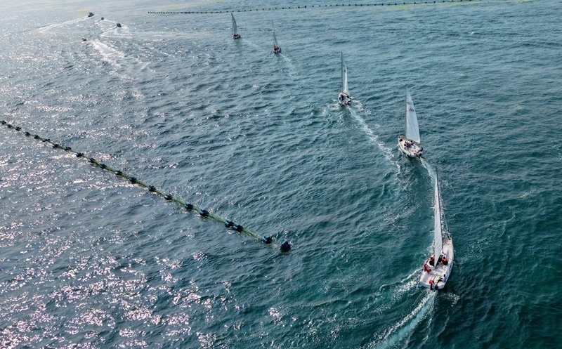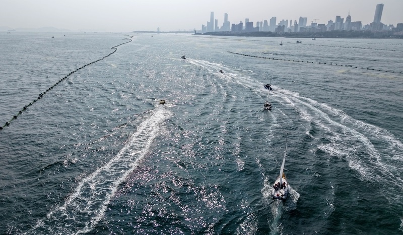 青島小麥島附近海域,市民和游客乘坐帆船參加海上巡游活動(dòng)(7月10日攝,無(wú)人機(jī)照片)。