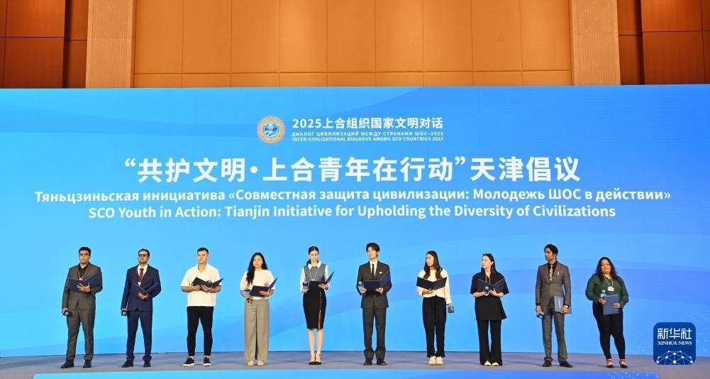 7月23日在2025上合組織國(guó)家文明對(duì)話現(xiàn)場(chǎng)拍攝的“共護(hù)文明·上合青年在行動(dòng)”天津倡議發(fā)布環(huán)節(jié)。新華社記者 李然 攝