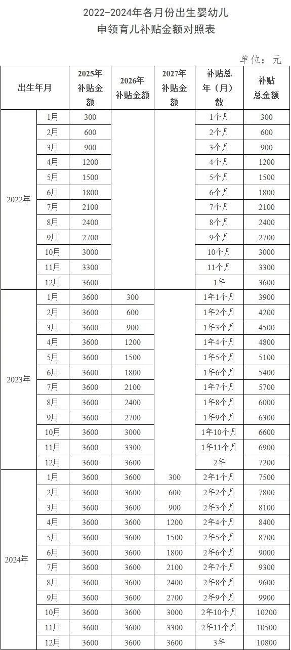 其中,對(duì)2025年1月1日之前出生、不滿3周歲的嬰幼兒,按應(yīng)補(bǔ)貼月數(shù)折算計(jì)發(fā)補(bǔ)貼。也就是說,2022年1月1日以后出生的符合條件的嬰幼兒,都可以領(lǐng)取育兒補(bǔ)貼。